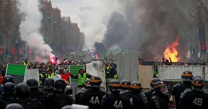 Suasana kericuhan saat aksi unjuk rasa di depan monumen Arc de Triomphe di Champs-Elysees, Paris,