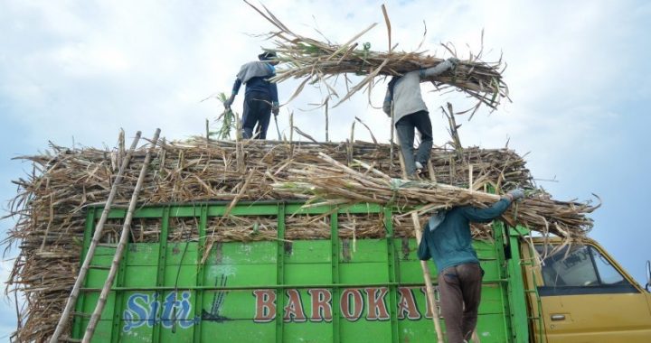 Petani menaikkan tebu ke atas truk saat panen di kawasan Tulangan, Sidoarjo, Jawa Timur, Selasa