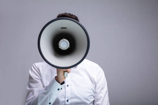 Man Doing Announcement Using Megaphone Against Gray Background