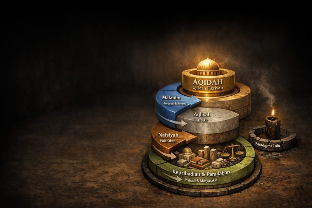 Ketika aqidah berfungsi sebagai asas berpikir, ia melahirkan mafahim (persepsi), membentuk pola pikir (aqliyah), menentukan pola sikap (nafsiyah), lalu menghasilkan kepribadian dan peradaban. Sebaliknya, ketika aqidah kehilangan fungsi epistemologisnya, masyarakat dapat tetap mengaku beriman tetapi realitas kehidupannya berjalan dengan paradigma lain.